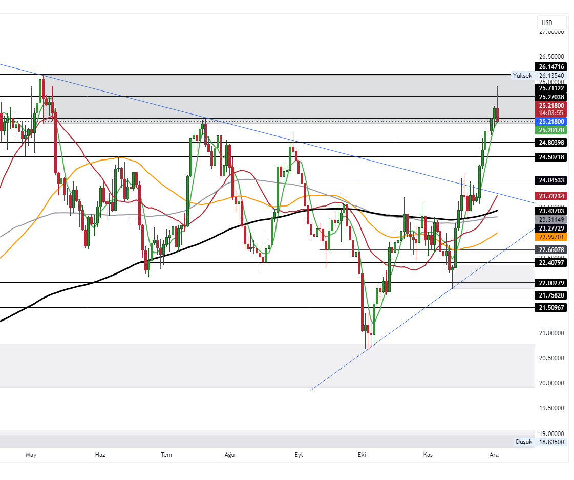 Güncel görünüme baktığımızda yükselişlerin kritik 25.27 direncinin üzerinde kadar devam ettiği görülmekte. Ancak etkili olan kar satışların bu seviye üzerinde kalıcılığın sağlanmasını engellemekte. Kar satışlarının devam etmesi durumunda 25.19(5GHO) ve 24.80 seviyeleri takip edilebilir. Yukarı yönlü hareketin devamı durumundaysa 25.27 üzerinde kalıcılık aranmalıdır.