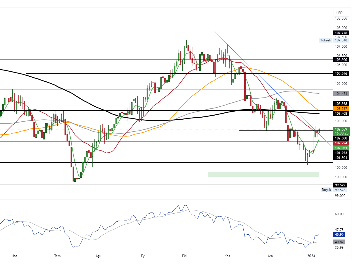 Geçtiğimiz yılın son iki ayında aşağı yönlü bir seyir izleyen dolar endeksi, 100.70 desteğinden alıcı bulmasıyla birlikte yeni yıla yükselişle girdi. An itibariyle 102.50 direncini aşmaya çalışan endekste direnç üstü kapanışlar takip edilebilir. 102.50 seviyesinin aşılması durumundaysa yükselişlerin 200 günlük hareketli ortalama olan 103.56’ya kadar devam etmesi beklenilebilir. Aşağı yönlü fiyatlanmaların gelmesi durumundaysa 102.29 (22GHO) ve 101.90 destekleri izlenebilir.
