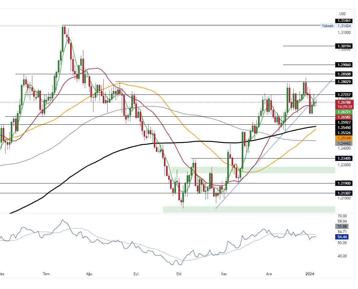 Dolar endeksindeki yukarı yönlü hareket nedeniyle aşağı yönlü bir hareket sergileyen parite, son gelen satışlarla birlikte yükseliş trendi aşağı yönlü kırmıştı. An itibariyle 1.2680 seviyelerinde fiyatlanan paritede, 1.2558 (22GHO) ve 1.2592 seviyeleri destek olarak takip edilebilir. Olası yükseliş hareketlerindeyse 1.2725 ve 1.2802 dirençleri hedeflenebilir.