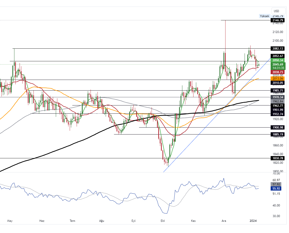 Fed, geçtiğimiz yılın son toplantısına ait tutanakları Çarşamba günü yayınlamıştı. Tutanaklara göre, yetkililer faiz oranlarının en yüksek noktada veya yakınında olduğunu, enflasyonun yükselme tehlikesinin azaldığını ve 2024 yılında faizlerin düşürülmesinin beklentiler dahilinde olduğunun işaretleri verildi. Ancak faizlerin yıl içerisinde ne zaman düşürülmeye başlayacağına dair belirsizliklerin olması, faiz indirimi beklentilerini fiyatlayan Ons Altın’ın bir miktar düşüş göstermesine neden oldu. Dün, ABD’de özel sektör istihdamı aralık ayında 115.000 beklentisini aşarak 164.000 arttı. Hizmet Sektörü Satın Alma Müdürleri Endeksi (PMI) verisi de 51,3’ten 51,4’e yükselirken, Bileşik PMI ise 51’den 50,9’a geriledi. Bugün ABD’den tarım dışı istihdam, işsizlik oranı ve ortalama saatlik ücret artışı verileri açıklanacak. Tarım dışı istihdamın aralık ayında 170.000, işsizlik oranının %3,7’den %3,8’e, ortalama saatlik ücret artışının ise aylık %0,3, yıllık %3,9 olması öngörülüyor.