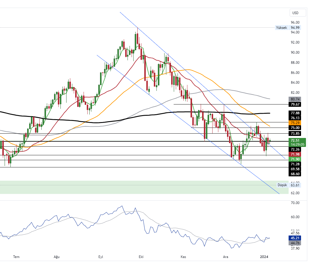 Kızıldeniz’de ki gerilim ve stoklardaki azalışlarla birlikte bir miktar toparlanan ham petrolde gün içerisinde 73.85 ve 75.00 dolar dirençleri hedeflenebilir. Aşağı yönlü fiyatlamalardaysa 72.00 (22GHO) ve 71.28 destekleri takip edilebilir.