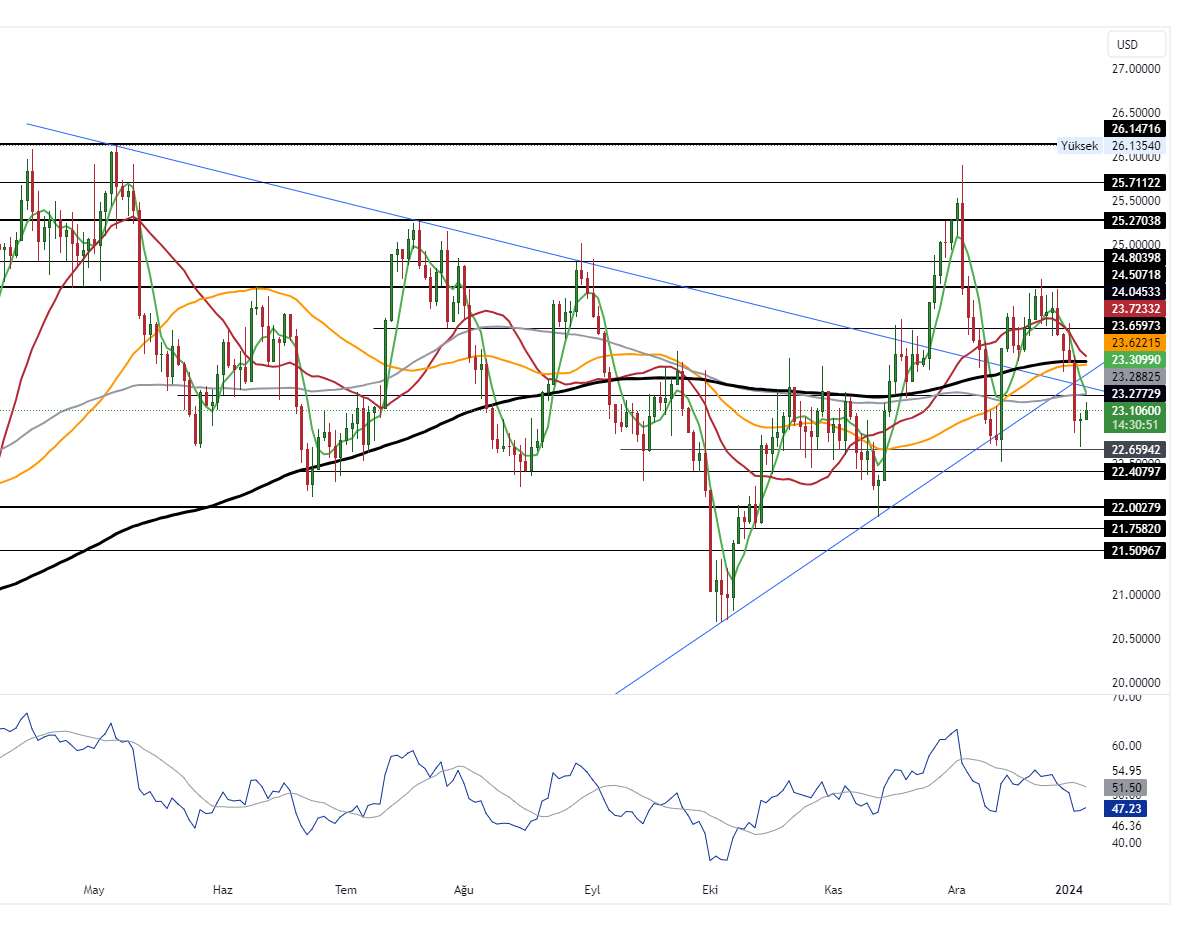 Hafta içinde gelen düşüşle birlikte 200 günlük hareketli ortalamanın sert bir şekilde kırıldığı ve satışların 23 dolar seviyesine kadar derinleştiği görülmekte. Gün içerisinde 22.85 – 22.65 bandı destek olarak takip edilebilir. Olası toparlanma hareketlerindeyse 23.27 (100GHO) ve 23.66 (200GHO) seviyeleri hedeflenebilir.