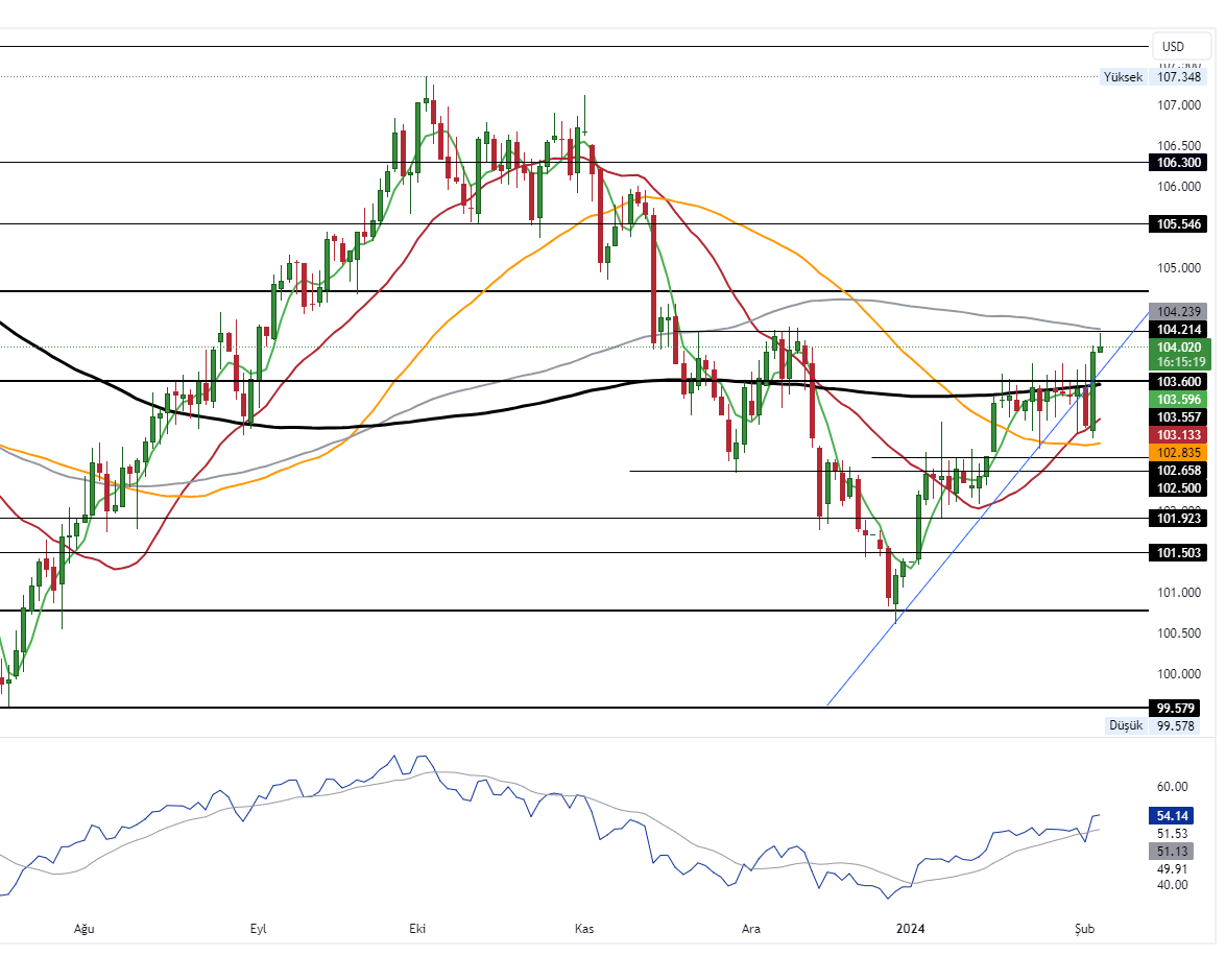 Fed toplantısının ardından alıcılı bir seyir izleyen dolar endeksi, elde ettiği kazanımları koruyamamış ve aşağı yönlü hareketlenmişti. Ancak Cuma günü açıklanan tarım dışı istihdam verisiyle birlikte yeniden yukarı yönlü hareketlenen dolar endeksi, 104.00 seviyesinin üzerine kadar yükseldi. Gün içerisinde 104.20 seviyesi önemli bir direnç olarak takip edilecek. Bu seviyenin aşılması durumunda 104.70 seviyesi hedeflenebilir. Geri çekilmelerin yaşanması durumundaysa 103.80 ve 103.60 seviyeleri kısa vadeli destekler olarak takip edilebilir.