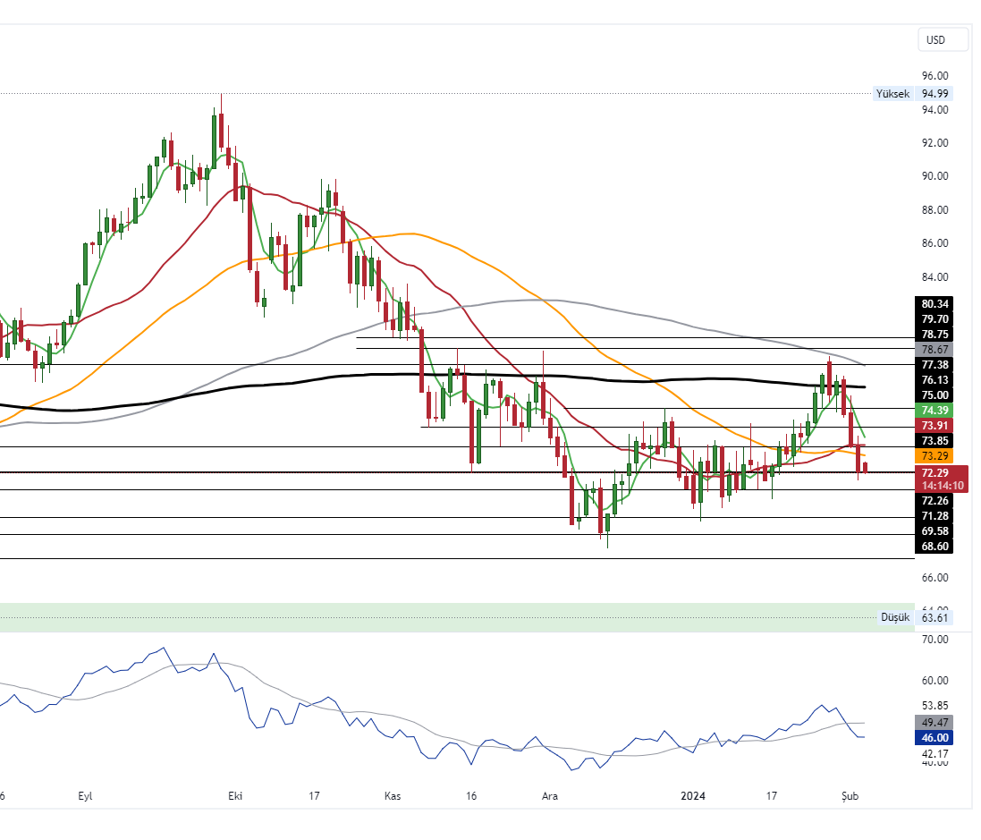 Geçtiğimiz hafta sert satışlara maruz kalan petrol fiyatları güne 72.80 seviyelerinden başladı. Aşağı yönlü fiyatlanmaların devam etmesi durumunda 72.25 ve 71.28 destekleri takip edilecek. Olası toparlanma hareketlerindeyse 73.85 ve 75.00 dolar seviyeleri izlenebilir.