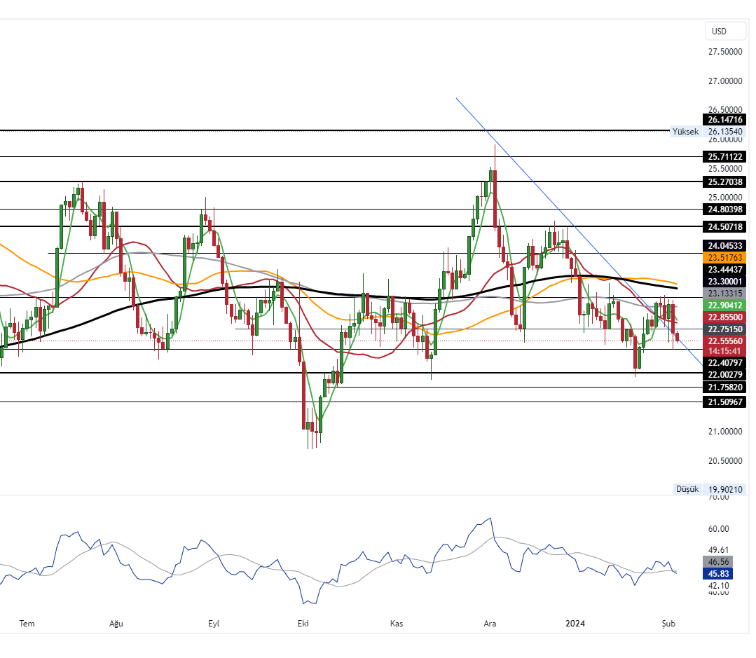 Ons Gümüş, güçlü gelen tarım dışı istihdam verisinin ardından 23 doların altına geriledi. Satıcılı görünümün devam etmesi durumunda 22.40 ve 22.00 seviyeleri kısa vadeli destekler olarak takip edilebilir. Yukarı yönlü hareketlenmelerdeyse 22.75 ve 23.13 seviyeleri izlenebilir.