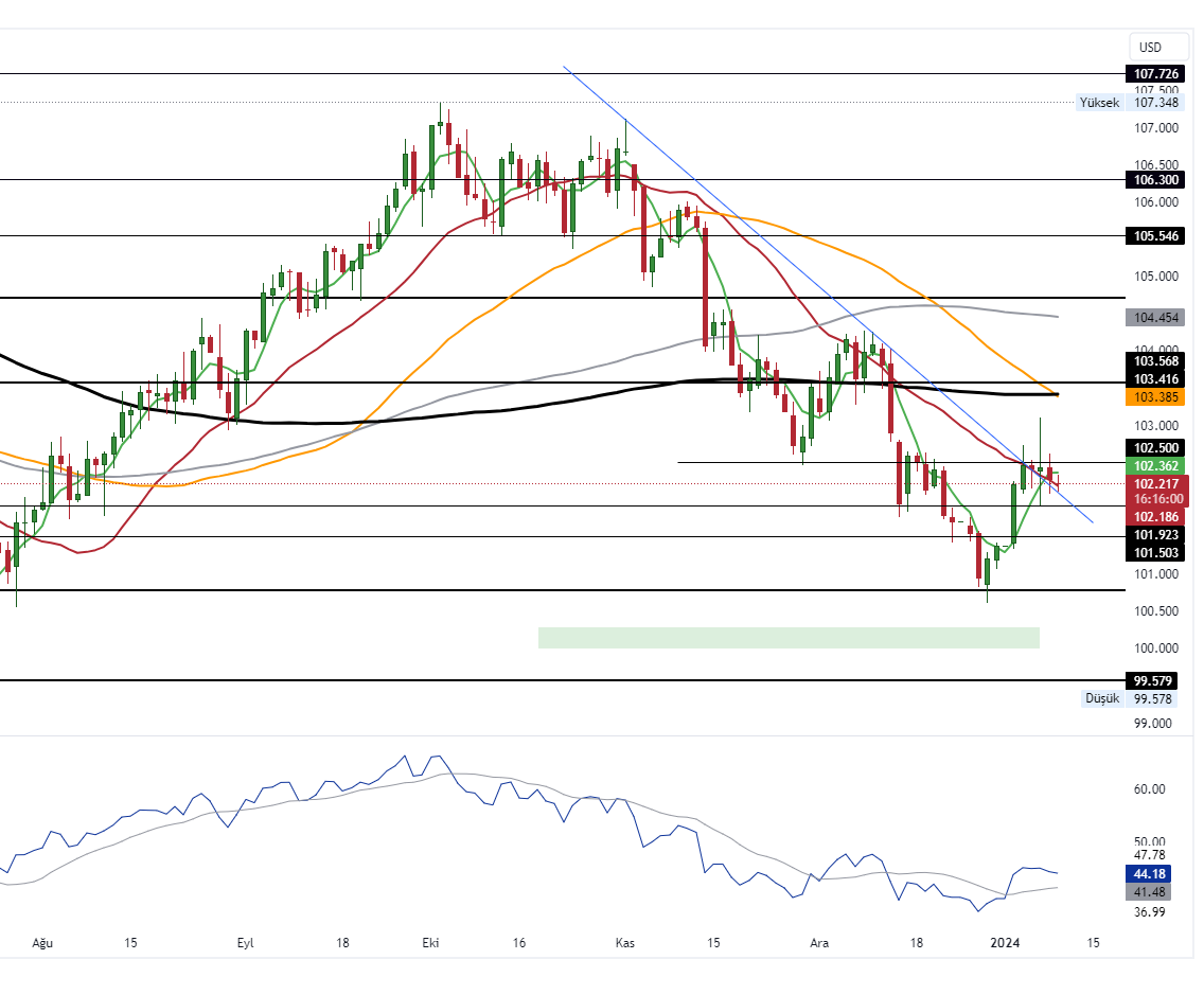 Teknik olarak incelediğimizde 100.70 desteğinden alıcı bulan dolar endeksi, 102.50 direncini aşmakta zorluk çekiyor. 102.50 seviyesinin altında kalıcılık 101.90 ve 101.50 bandına geri çekilmeleri beraberinde getirebilir. 102.50 seviyesinin aşılması durumundaysa 200 günlük hareketli ortalama olan 103.41 önemli bir hedef noktası olarak takip edilebilir.