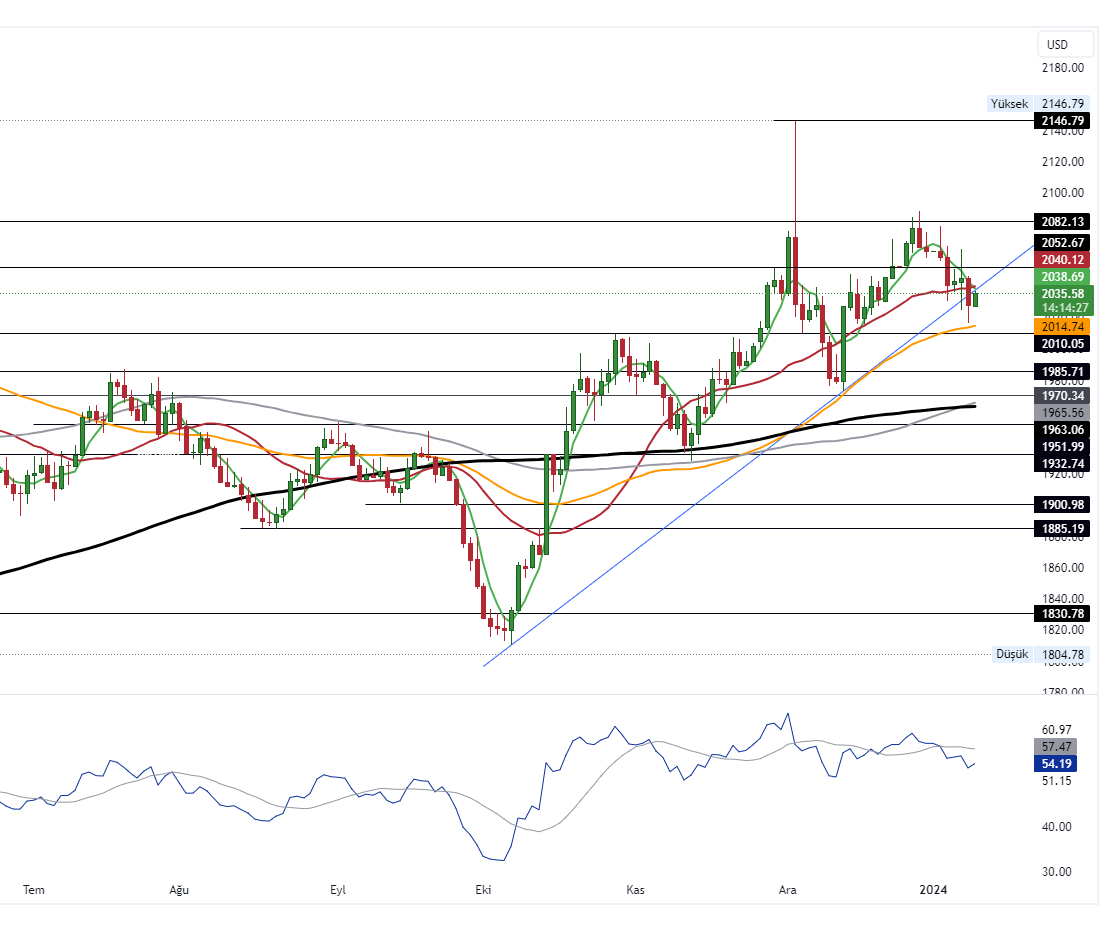 Yeni güne alıcı bir şekilde başlayan Ons Altın’da yukarı yönlü hareketin devam etmesi durumunda 2040 seviyesi takip edilecek ilk direnç olacak. 2040 seviyesinin aşılması durumundaysa 2052 – 2080 bandı hedeflenebilir. Aşağı yönlü fiyatlanmalardaysa 50 GHO’nın desteklediği 2010 desteği kritik olacaktır.