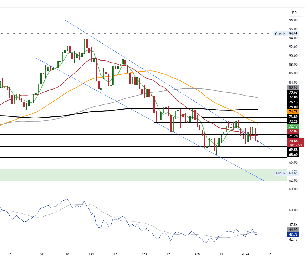 Haftaya satıcılı bir şekilde başlayan Ham Petrol’de 70.40 ve 69.60 dolar seviyeleri destek, 71.28 ve 72.25 dolar seviyeleriyse direnç olarak takip edilebilir.